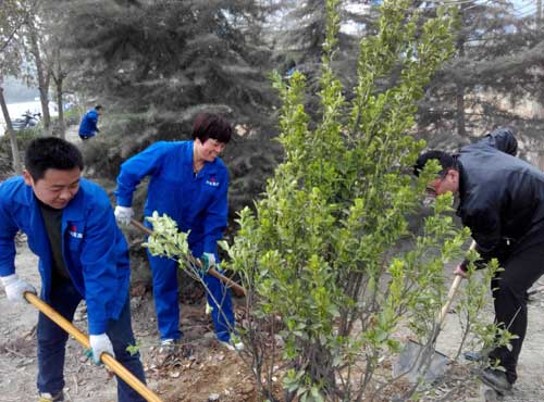春光无限好,植树正当时。近日,在集团公司组织下,各分公司及后勤部门积极行动,抢抓时间,对集团所属厂区进行美化绿化,全面掀起植树热潮。 植树现场,人潮涌动,一派繁忙景象。各部室领导亲自带队,率先垂范,广大员工争先恐后,行动迅速,大家挥锹铲土,踏土夯苗,浇水封实,加班加点,突击完成。几天功夫,厂区砂岩堆,林间、路旁,一行行排列整齐的冬青树、一簇簇点缀相间的石楠树展现在眼前,焕发出了勃勃生机和活力。 此次植树活动,全员参与,见缝插绿,种下一片树,营造一片绿。形成了共建美好大地的良好氛围。