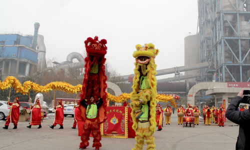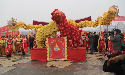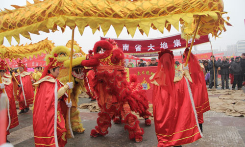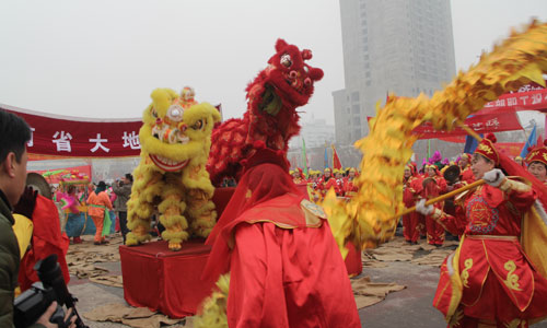 龙腾狮跃闹新春,中原大地喜事多。2月8日(农历正月初九)上午,大地集团邀请许昌盘鼓队,武术龙狮团70多人参加宝丰县第二十届民间艺术大赛。通过精彩的文艺表演向全县人民问好,为广大群众奉上一场活色生香的文艺盛宴。 喧天的锣鼓敲起来,威武的巨龙舞起来,凶猛的狮子跃起来。大地集团表演的龙狮舞活灵活现,形威神俏。一条蛟龙时而上下翻腾,时而左右滚动。两个衣着不同服饰的狮子刚强勇猛,竞相争霸。时而龙狮腾跃,时而蛟龙出海,时而双狮争斗……。惟妙惟肖、滑稽幽默的表演赢得了在场观众的阵阵掌声和好评。大家纷纷拿起摄像机、照相机或手机,记录下这精彩美好的瞬间。 金狮舞出了大地人意气风发、坚忍不拔的干事精神。蛟龙跃出了大地人披荆斩刺、战天斗地的决心和信心。迎着改革开放的春风,大地集团将继续乘风破浪,扬帆远航,驶向更加灿烂辉煌的明天!