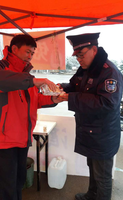 工作人员热情地为值勤人员斟酒