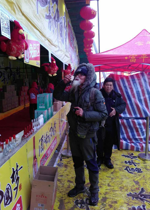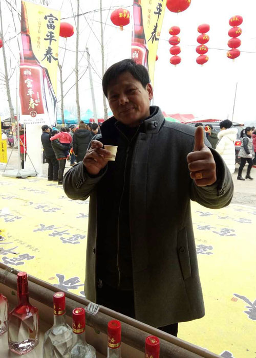 一位老人沉醉在品味美酒之中 同时,开展扫码抽大奖活动,共设置七个奖项,最高奖项为价值528元富平春尊品原浆一坛,数万份奖等你拿,综合中奖率达98%。书会现场开展的系列活动不断吸引着四面八方的来客蜂拥而来,扫码的、抽奖的、品酒的,火爆场面嗨翻天;开展你有宴席我送礼活动,凡在马街书会现场,预订2017年宴席活动的,当场送价值528元尊品原浆1坛,并有豪礼相送,不断为未婚青年送礼包,送惊喜,送实惠;开展停车送酒活动,为广大赶会群众提供停车点,每停一辆车送停车券一张,凭停车券可免费领取富平春F6一小瓶;开展金鸡迎春买赠酬宾活动。凡在马街书会期间,购买富平春华贵、F6、F3等酒品者,赠吉祥物金鸡一个,恭祝金鸡献瑞,新年大吉!……