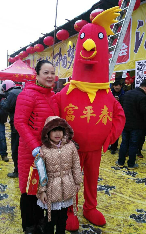 一位中奖女士与吉祥物金鸡合影 “非常感谢富平春为我们带来了惊喜,带来了情趣”,位刚刚中得一等奖的小伙高兴地把他中奖的消息发到了朋友圈。